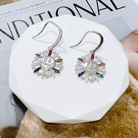 Rainbow color zircon happy face flower silver 925 hook earrings