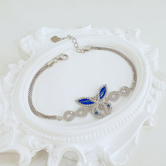 White zircon dark blue enamel butterfly silver 925 jewelry double box chain bracelet