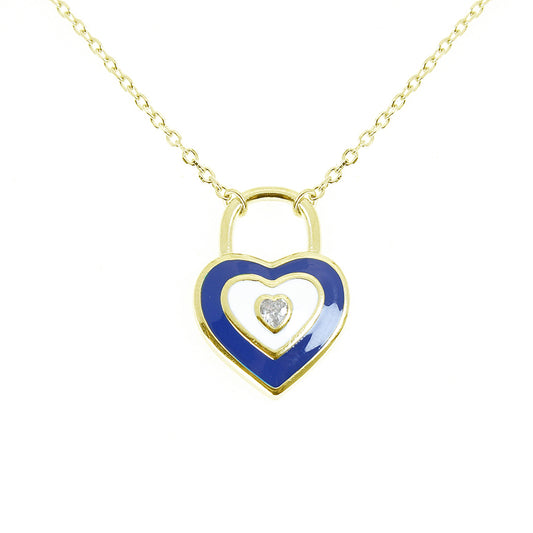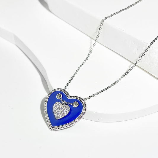 Silver House Dark Blue Heart Shaped Lock Enamel Round Shaped Zircon Silver 925 Necklace