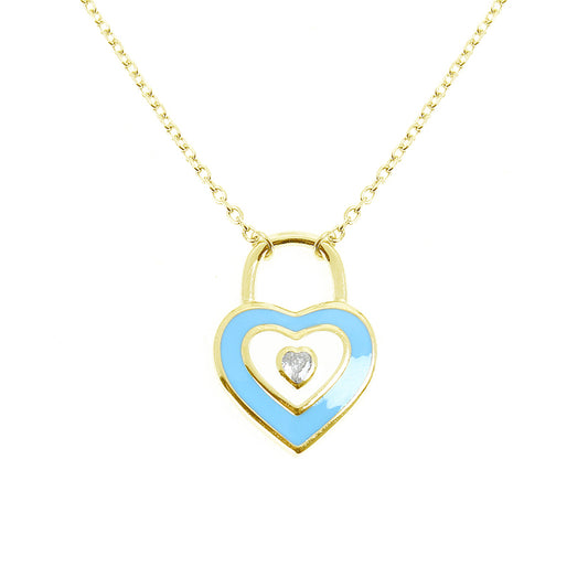 Silver House Light Blue Heart Shaped Lock Enamel Round Shaped Zircon Silver 925 Necklace