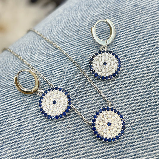 Sapphire and white zircon 13mm round shape evil eye silver 925 necklace