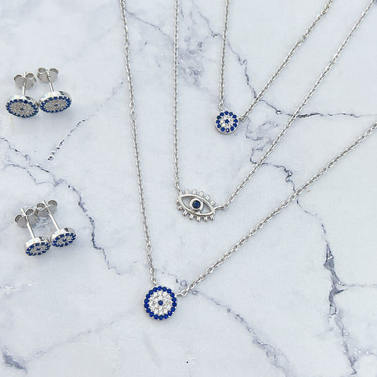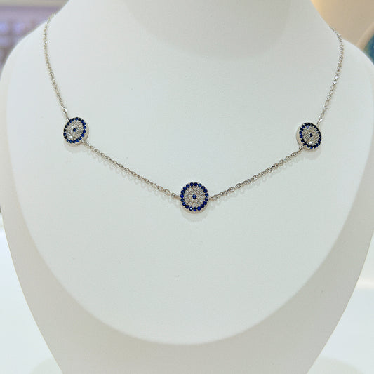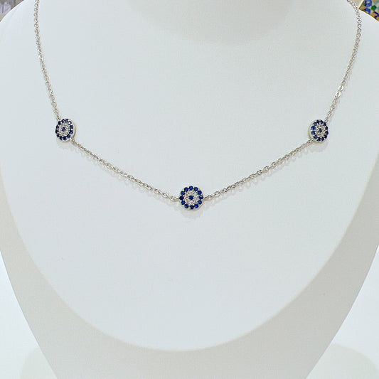Sapphire and white zircon 8mm round shape 3 evil eyes silver 925 necklace