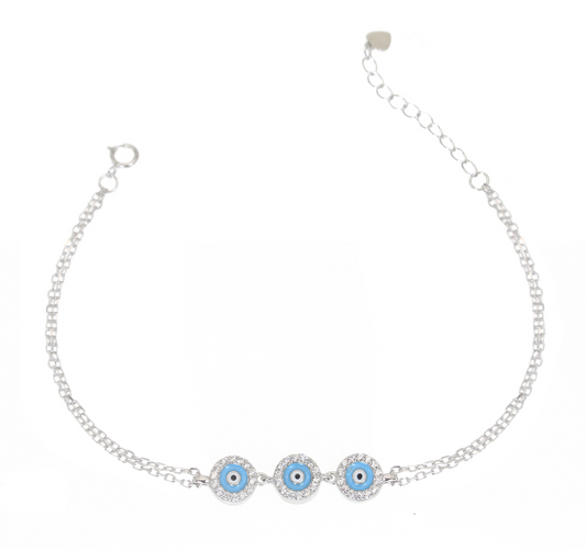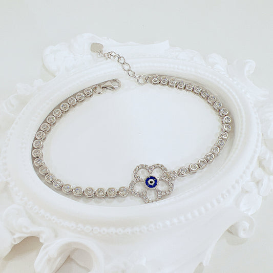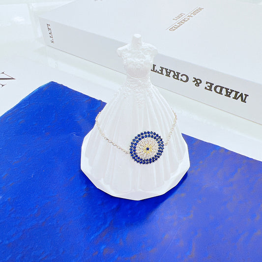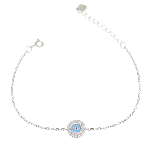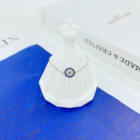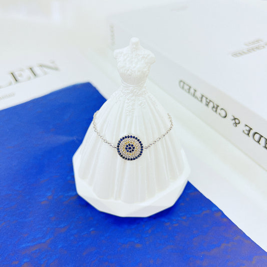 White zircon dark blue enamel round shape evil eye silver 925 bracelet