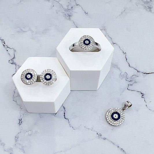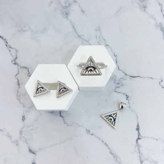 White zircon dark blue enamel triangle evil eye silver 925 jewelry set