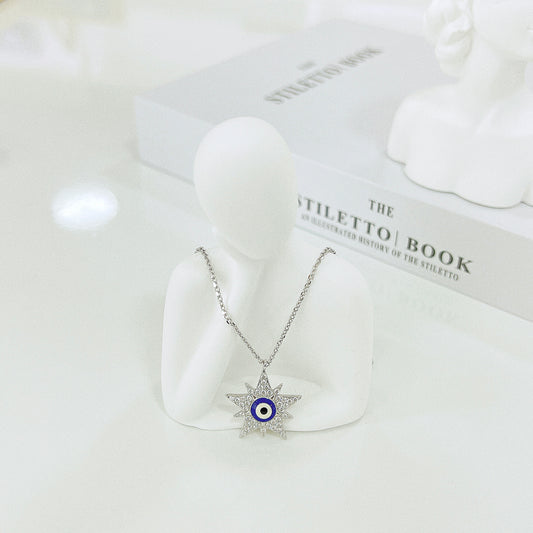 White zircon dark blue enamel star shape evil eye silver 925 necklace
