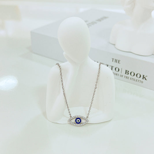 White zircon dark blue enamel marquise evil eye silver 925 necklace