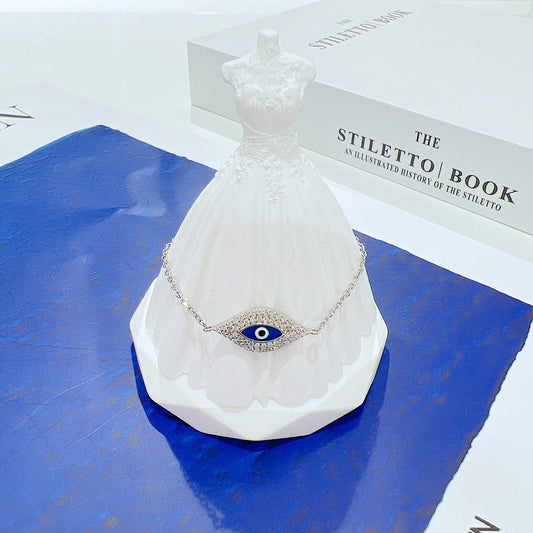 White zircon dark blue enamel marquise evil eye silver 925 bracelet