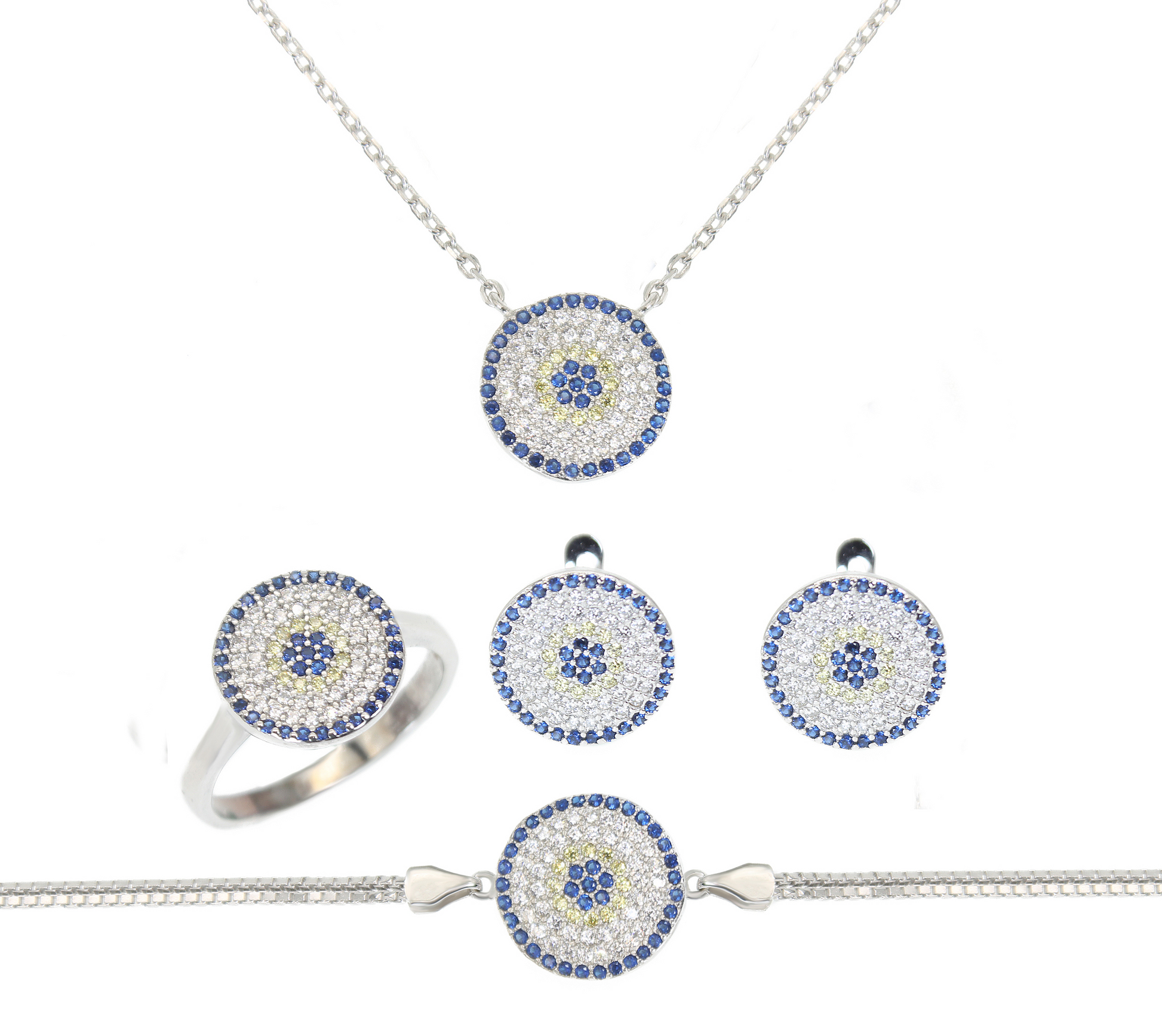Sapphire yellow and white zircon round evil eye silver 925 jewelry set